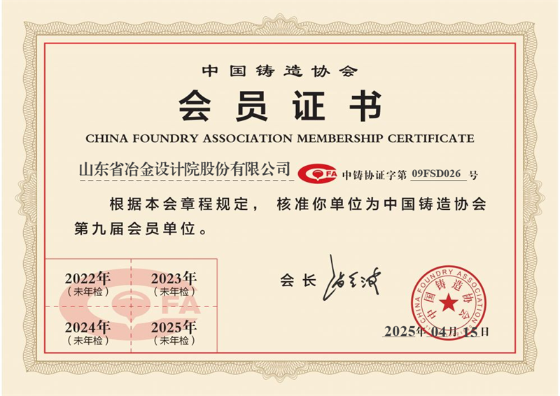 經過前期準備工作及入會申請,415日中國鑄造協會核準山冶設計成為協會會員單位(會員編號09FSD026)。